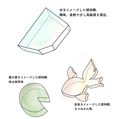 涼し気な雰囲気のある琥珀糖はパッケージのイメージである風鈴の柄の水、金魚、水草の形をかたどる。琥珀糖は和の素材を使用し、梅(水)、抹茶(葉っぱ)、なつみか(金魚)んの3種類。