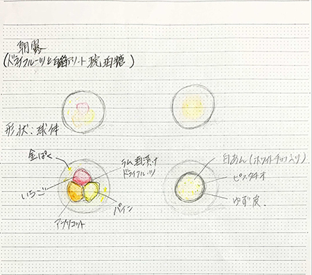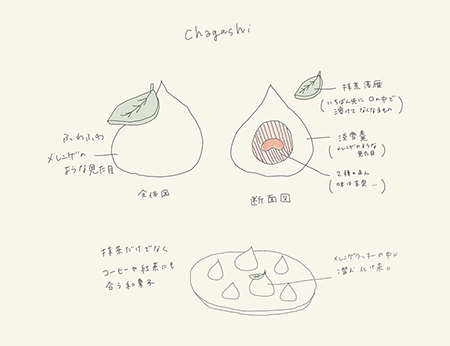 視覚的に和菓子とも洋菓子とも捉えられる茶菓子です。外側は淡雪羹で、中は餡が入っています。餡の味は抹茶、いちご、りんごを想定し、和洋関わらず様々な茶席で和菓子を楽しんでもらいたいという想いを込めました。
