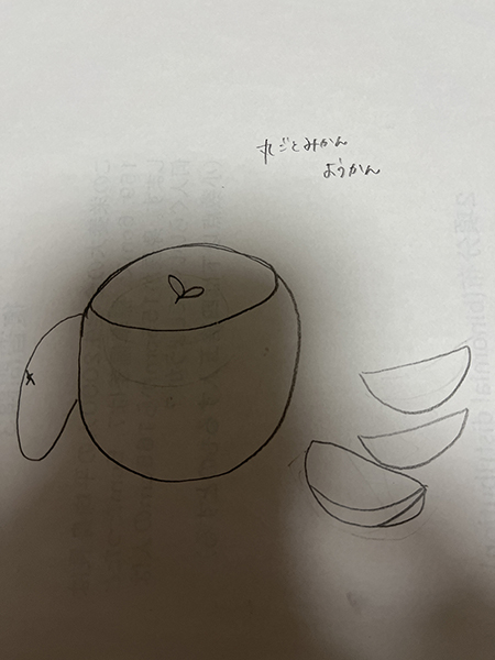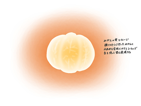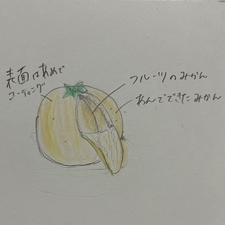 冷えきったランドセルを照らした夕日を横目に帰宅し、こたつで母と蜜柑を食べた記憶を思い出して名付けました。パッケージの皮を剥くと水飴の筋のついた蜜柑の和菓子が出てきます。