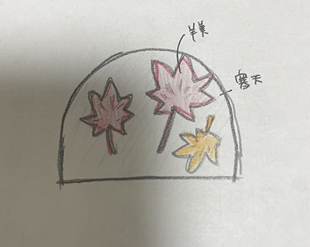 紅葉が満開に咲く前の秋の訪れを表しました。表面は遠くから見るとお花の形になるようにしました。和菓子は、寒天の中に紅葉の形をした羊羹が入っています。紐をほどくと、秋真っ盛りを感じられます。