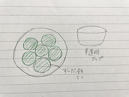 ずんだ餅を半透明のカップに入れ鮮やかな緑色が見えすぎすも分かるパッケージにしました。麻の葉柄のマステを折り鶴に貼り付けました。麻の葉柄には「子供の健やかな成長の願い」が込められており、鶴の背中に乗せて大きく羽ばたいてほしいという意味を込めました。ずんだ餅は「大きく育ずんだ」と掛けました。
