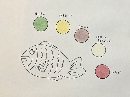 色々な味のたい焼きを一度に味わいたいと思ったことから、小さめのたい焼きに好きなソースや餡を付けて食べる和菓子を考えました。ソースは絵の具を、パレットは鯛の形を意識してパッケージを作りました。そのままでも、ソースに付けても、複数のソースを混ぜても楽しめます。