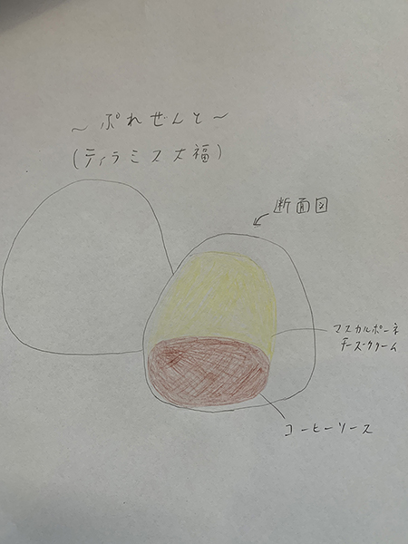 この和菓子にはちょっとしたワクワク感が込められている。クリスマスが近いことから菓銘は“ぷれぜんと”にした。大福のフレーバーに使われているティラミスの発祥地イタリアの国旗の色、クリスマスのイメージカラー共に赤と緑であることから、緑色の和紙と赤いリボンを使用した。