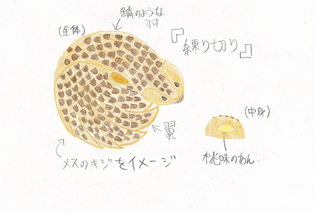 雌の雉子をモチーフした練り切り。雌は雄と比べるとあまりにも作品数が少なく、華美でないからと見向きもされないことが悲しかった。だから、この愛らしい雌の雉子が一つでも多くの作品の一員になれるように。という意味を込めた。