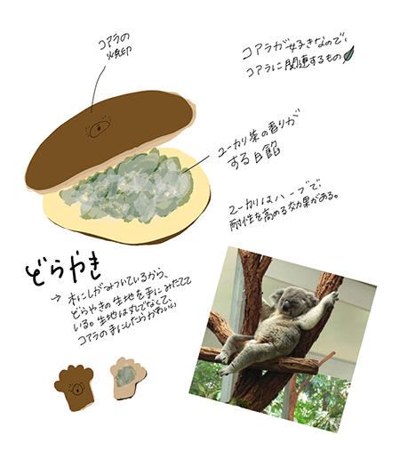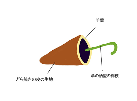 傘を模して制作しました。黒文字がその場になくても手を汚さずに食べられるよう、菓子に傘の柄型のプラスチックの楊枝を刺しました。また、菓子部分は閉じた傘のように、円錐で、どら焼きの皮の中に羊羹を入れたシベリア風の菓子です。