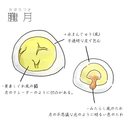 朧月とはぼんやりとしてはっきりしない様子の月のこと。雲をかき分けて包みを開けば、おぼろげに見えるのはまんまるの月。ひんやりとした夜を感じる水まんじゅうです。隠れていても存在感のある月の不思議な魅力をぜひ感じてください。