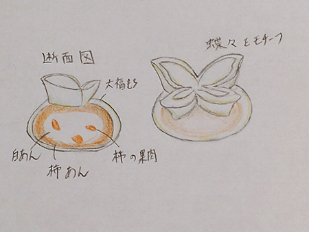 蝶々をイメージした和菓子です。実りの秋は、実った果実などを思い浮かべますが、それには蝶々の手伝いがあったことを表現し、菓銘の意味に込めました。中には柿あんや柿の果肉が入り、程よい甘さの和菓子になっています。