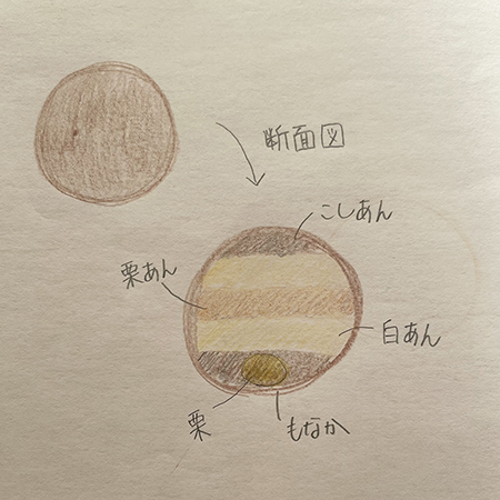丸い形のモナカの中にこし餡・白餡・栗餡と栗が入った、紙ふうせんをイメージした和菓子です。秋の和菓子にしたかったので、栗を使っています。見た目はシンプルですが、一口食べると層になってて、目と口で楽しむことができます。