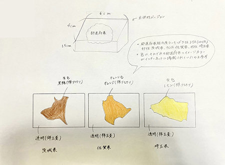 夏のいいところを詰め込んだお菓子です。この和菓子を食べて、この夏なにをしようかワクワクしたり、青春や懐かしい記憶を思い出したりすることを願ってつくりました。パッケージから中が透けているのが特徴です。