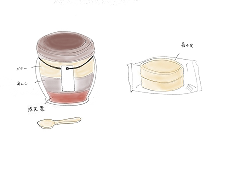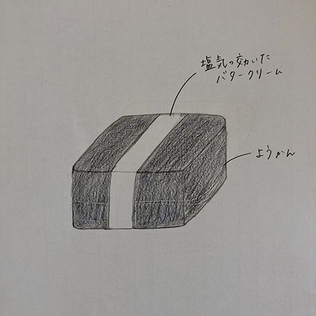 羊羹にバタークリームをサンドし、あんバターを表現した和洋折衷の和菓子。羊羹にあまり馴染みのない人でも食べやすいよう現代風にアレンジしました。銀紙の包装と箱の色で、バターや羊羹の包装を連想させるパッケージに仕上げています。