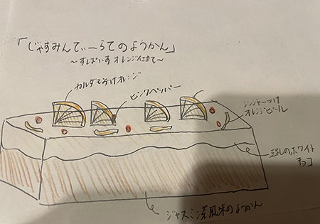 ジャスミンティー風味の羊羹にホワイトチョコと冬に旬のオレンジ、そして体がぽかぽかする効果のあるスパイスを使用している為、ジャスミンがホワイトチョコとスパイス、オレンジを見にまとい冬の準備を始めたように見えました。そのため、この菓銘にしました。