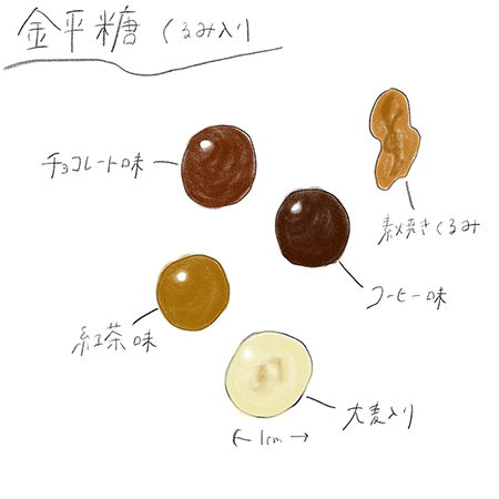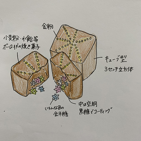 カリッとした皮の中には優しい甘さの金平糖…たくさんの食感を味わえる和菓子です。コロナによって「飛沫」という言葉を頻繁に聞きますが良い印象はありません。そんな飛沫を和菓子でおいしいに変えたいと考えました。皮は黒糖の飴で奥深い味わいが広がります。
