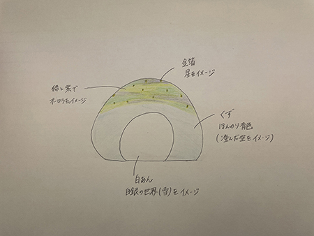 冬の澄んだ空に映し出される極光と、白銀の世界をイメージした白あんを1つにすることで、冬の全てをこの和菓子で体感してほしいという思いから、透明でどんな色にも染まる水まんじゅうとした。