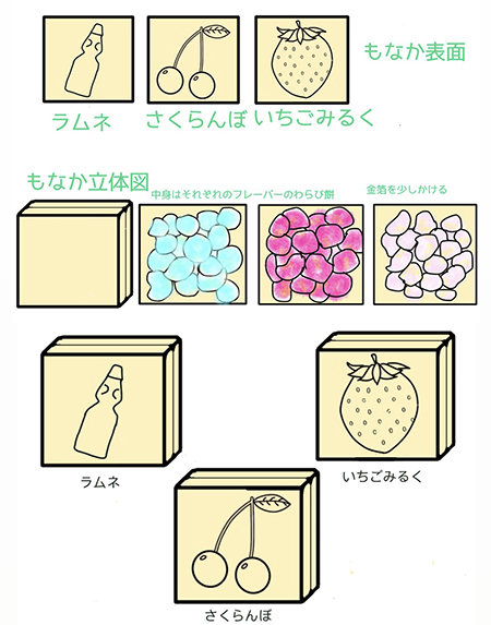 最中の中にらむね・さくらんぼ・いちごみるく味のわらび餅が入っており駄菓子のような懐かしい味が楽しめます。爛柯には「遊びに心を奪われ時が経つのを忘れる」と言う意味があり、子供の頃の思い出を懐かしんで食べてほしいと思い命名しました。