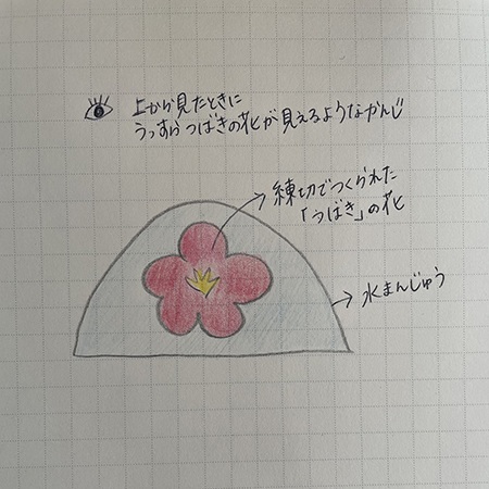 最近寒くなってきたので冬を表現した和菓子。かまくらの中で暖をとるために集まった人々の笑顔を真っ赤な椿で表現している。水饅頭の中に練りきりの椿を入れ、淡白な味の水饅頭と練りきりの餡の甘さでバランスをとった和菓子。