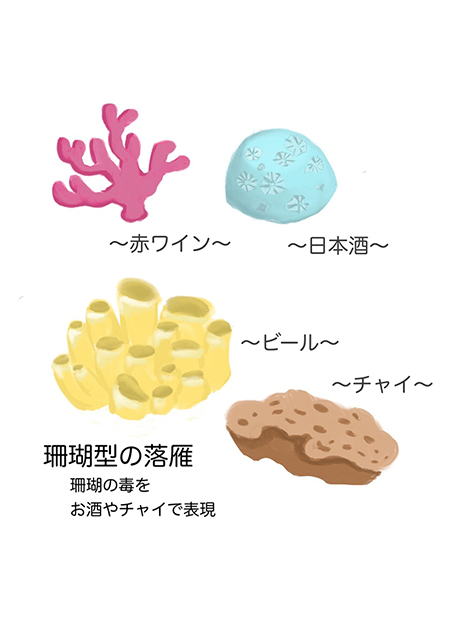 珊瑚に毒があることを知っていますか?このお菓子は珊瑚型の落雁で、珊瑚の毒をお酒(日本酒、ビール、赤ワイン)やチャイなどで表現しました。パッケージは海をイメージして、波型、青色、白色にしました。