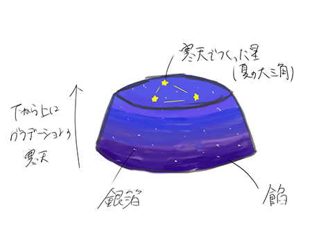 餡で深闇を、全体を紫と青のグラデーションにして夜空を、銀箔でキラキラと輝く小さな星々を表しました。夏の大三角は黄色の寒天です。