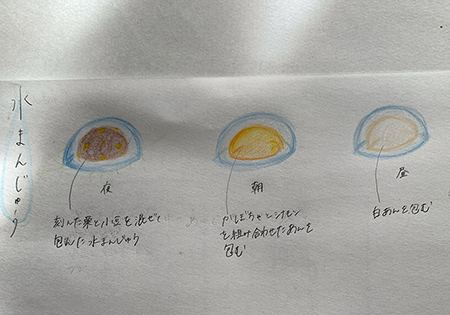 朝の日の出・昼に見える月 ・夜の星空を餡、澄んだ空気の透明感を水まんじゅうで表現しました。