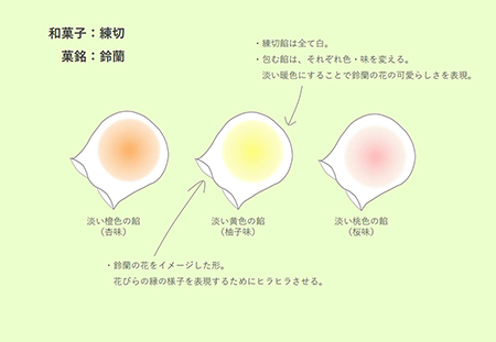 鈴蘭の花の形をした練切で、餡は杏・柚子・桜の3種です。既存の練切では、表面に鈴蘭の全体像を描いたものが多いため、一つひとつの花の可愛らしい形を感じられるようにしました。パッケージに詰めると鈴蘭の全体像が浮かび上がります。