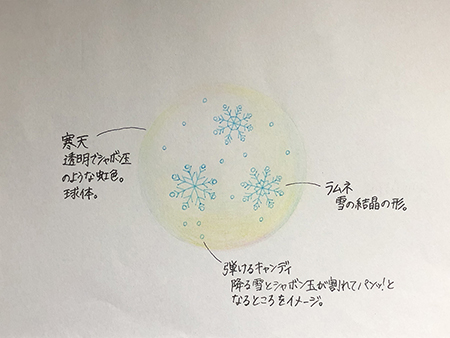 雪の結晶とシャボン玉をモチーフにした菓子。すぐに消えてしまう雪の結晶とシャボン玉をいつまでも見ていたいという思いから考えた。シャボン玉は寒天、その中に雪の結晶の形をしたラムネ、降る雪・シャボン玉が割れた瞬間を表現した弾けるキャンディを閉じ込めた。