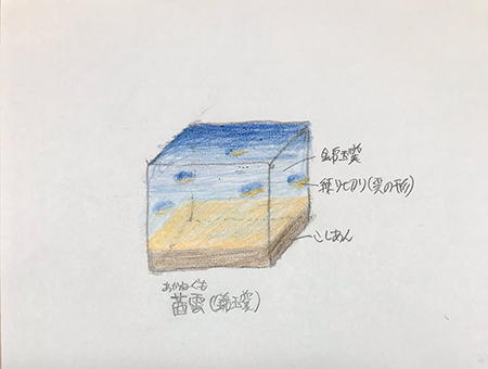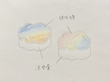 朝焼けや夕焼け、時間によって様々な色を見せてくれる空。そんな空の色を、雲に写したお菓子です。真っ白な淡雪羹と、透けるような琥珀糖で雲に写る色を表現しました。食べるときが癒しの時間になればいいな、という思いを込めました。