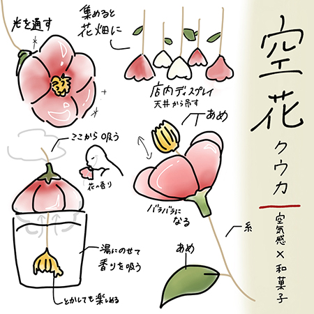空気感を和菓子で表現しました。和菓子は中身がぎっしり詰まったものが多いと感じたからです。花をモチーフにした飴細工で、「吊す」や「吸う」ことで様々な空気感を楽しむことができます。パッケージも風通しの良いデザインにしました。