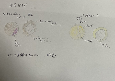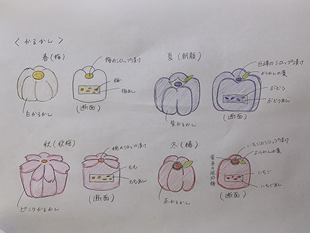 季節の移ろいと共に“変化”する花。郷土菓子の発展のために大切な“変化”。この2つの“変化”を掛け合わせて“変花”とした。郷土菓子「かるかん」を四季それぞれの花で象り、旬な果物を組み合わせることにより見た目と味で四季を楽しめる。季節によって見た目や味が異なるので、変化を好む人にはこの“変花”を楽しんでもらいたい。
