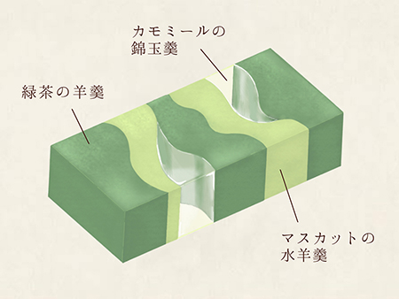 喫茶去(きっさこ)は「まぁ、お茶でも飲みましょう」という意味です。お茶の時間は心を落ち着かせてくれます。このお菓子を食べて、日常の忙しさを忘れ、ほっと一息ついてほしいとの想いを込めました。緑茶の羊羹、マスカットの水羊羹、カモミールの錦玉羹から成ります。安らぎの色である緑を基調とした模様で、木漏れ日やそよ風を表現しました。カモミールの香り、緑茶の香りは癒しを与えてくれます。