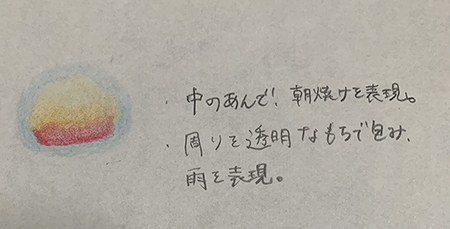 中に入っている餡の色が濃い紅黄色から薄くなっているグラデーションで朝焼けを表現しました。また、綺麗な朝焼けがみられるとその後に雨が降ると言われているため、餡の周りを透明な餅で包むことで雨を表現しました。視覚から楽しむことを意識したため、味は水饅頭のようなイメージでシンプルに甘い和菓子です。