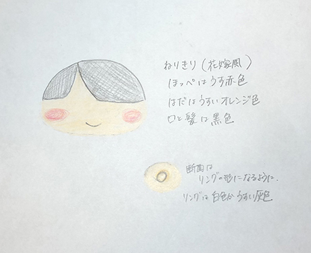 練り切りを花嫁の形にして、パッケージで花嫁までの道を表現しました。また、お菓子の断面は指輪の模様になるようにしました。