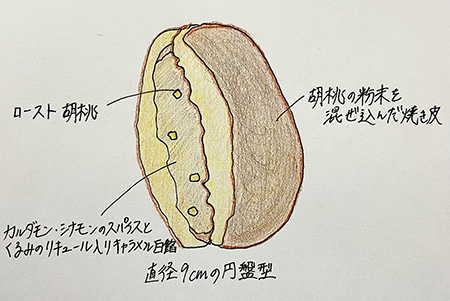 菓銘の「おくるみ」は、赤ちゃんを優しく包む布のおくるみと種子である胡桃を掛けた2つの意味をもつ。胡桃の風味が感じられる焼き皮の中には、カルダモンやシナモンのスパイス・胡桃のリキュール・キャラメルが入った白餡とロースト胡桃入り。秋冬に食べたくなる、ほっこりする甘さのどら焼きである。
